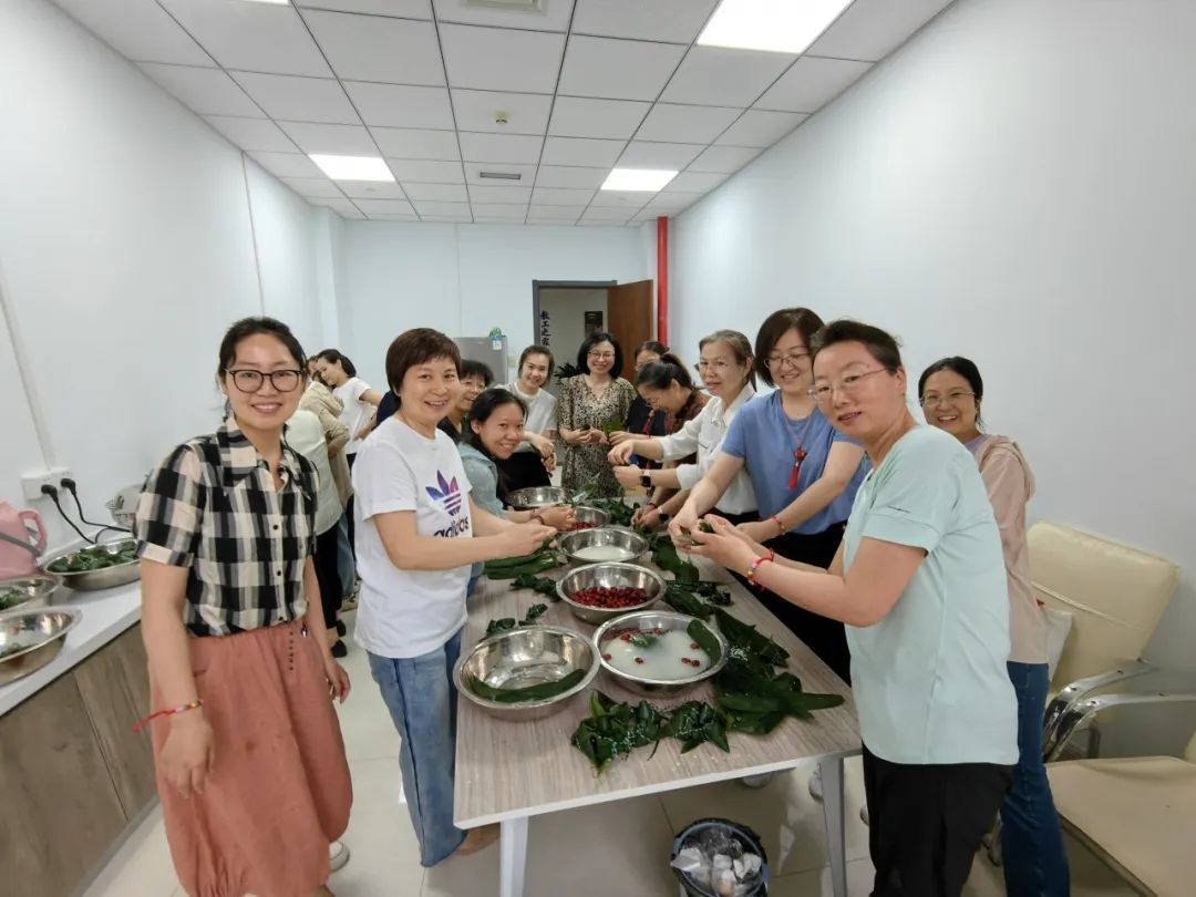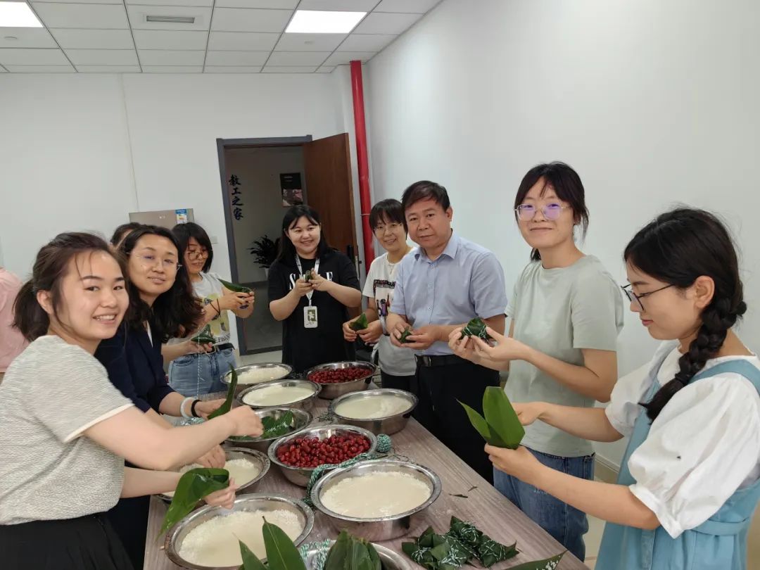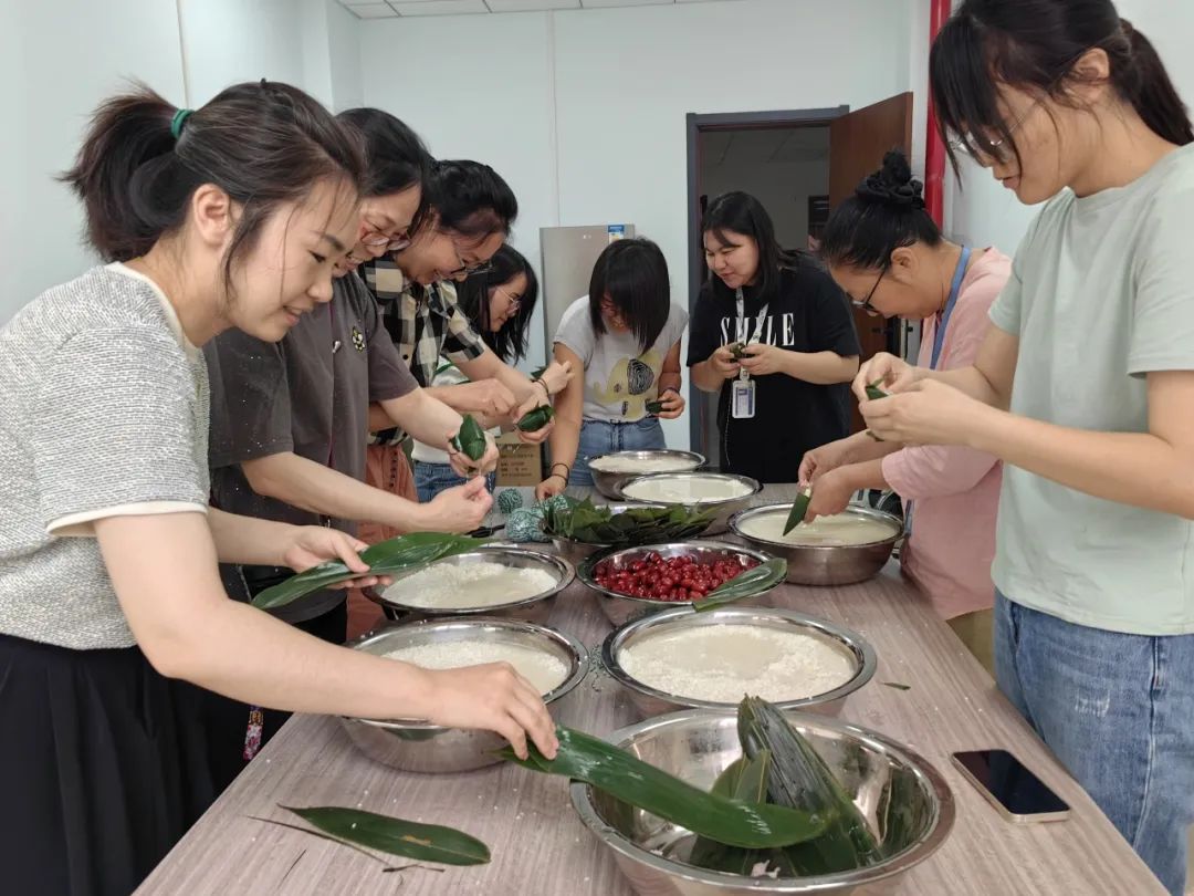 暖意浓浓,老师们佩戴香囊和五彩绳,交流着家乡的端午习俗。包粽子比赛热闹非凡,学院准备了粽叶、糯米、红枣等材料,老师们做漏斗、填糯米、包裹、捆绑,一片绿叶、一缕清香、一根细绳包裹着华夏传承千年的味道,空气中弥漫着粽叶香。
