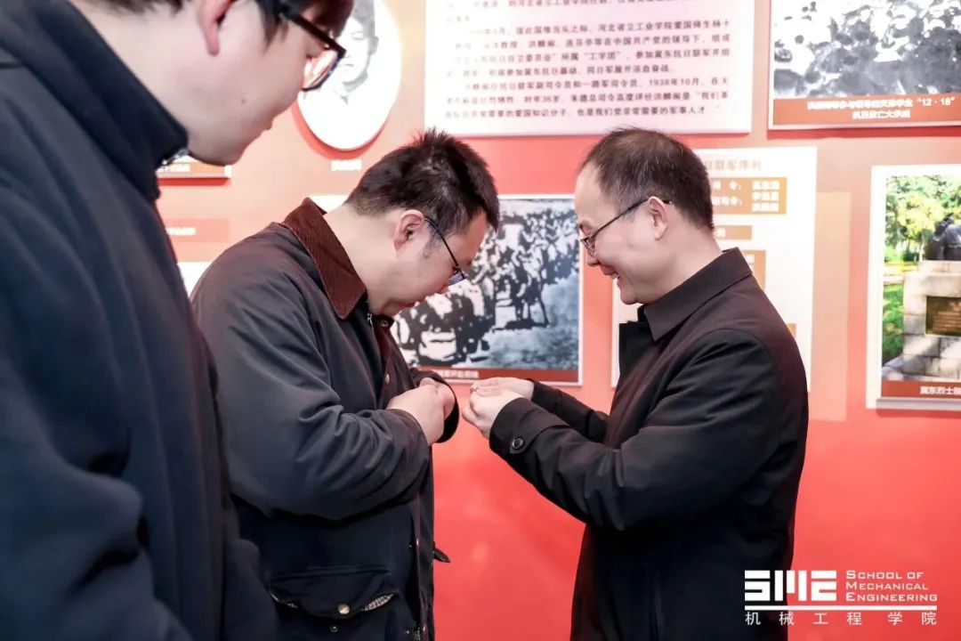戴士杰书记和王刚副院长为新入职教师佩戴校徽,校徽佩戴仪式加强了新入职教师作为一名“河工人”的归属感和荣誉感,激励着每一位新入职教师开拓进取、奋勇向前。