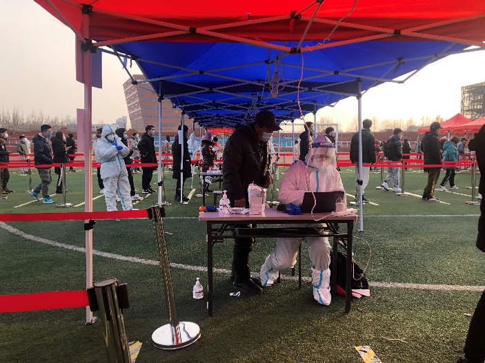 学校核酸检测大筛中程立金、高松岩配合医护人员做好信息录入、登记工作;张建军、杨伯军、孙凌宇组织好检测人员排队、做好后勤保障工作。
