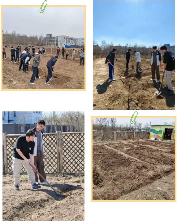 3月14日-19日,同学们开垦冬土,在责任田进行了松土开垄等一系列耕种准备活动。阳光下,同学们手持铁锨、锄头、耙子等工具,深翻冻土、疏松土壤,他们热情高涨,干劲十足。经过几日的辛苦劳动,土地翻整完毕,只待春耕。