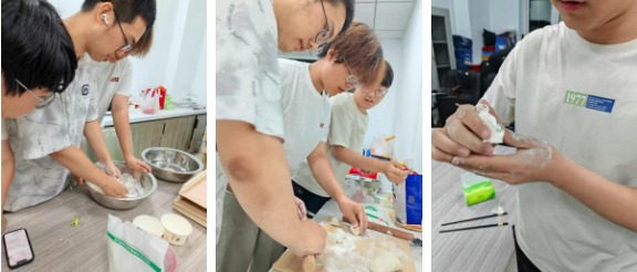 在饺子制作项目中,参赛小组成员分工明确,和面、擀皮、捏饺子,有条不紊地进行包饺子的工序。同学们紧密配合,轮流负责不同工序,展示了多种包饺子风格,丰富了大赛的创意性。