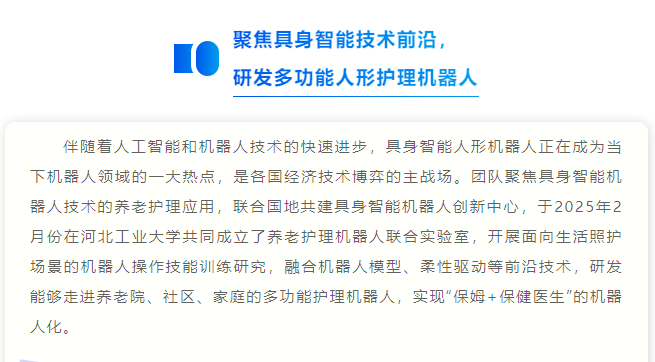 团队将通过高水平科学研究及与头部科技企业、医院、养老机构的协同创新,打造人机共融的养老新范式,加速科研成果落地,不断助力河北工业大学服务国家经济和社会发展的能力提升,推动国家“双一流”建设高质量发展。