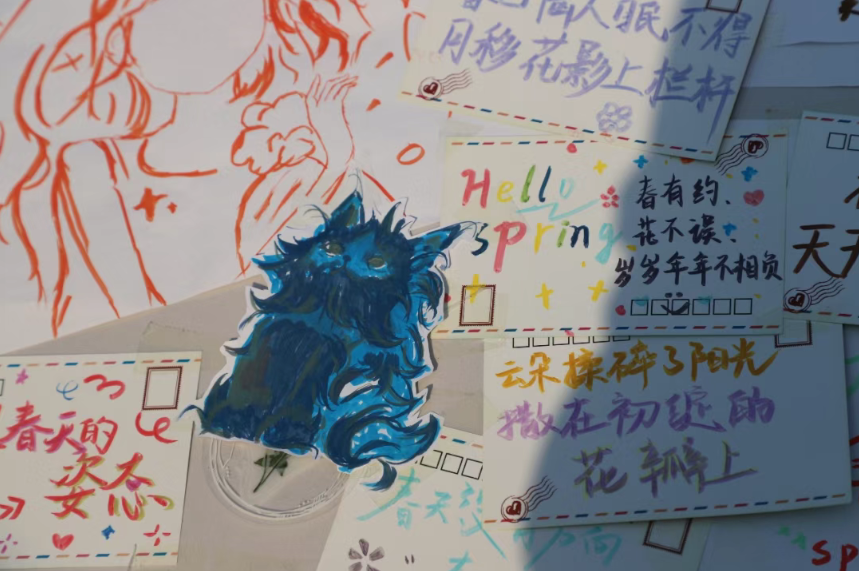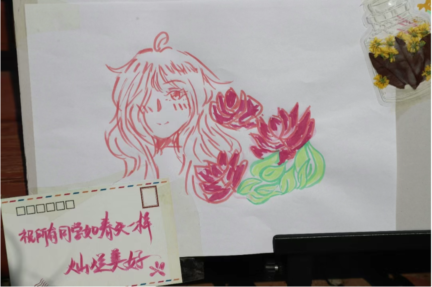 寻花打卡活动后,同学们来到体育中心南广场席地而坐,或画板彩绘、或DIY手环、或撰写明信片、或制作书签,通过不同的方式表达自己对于校园初夏美景的印象。
