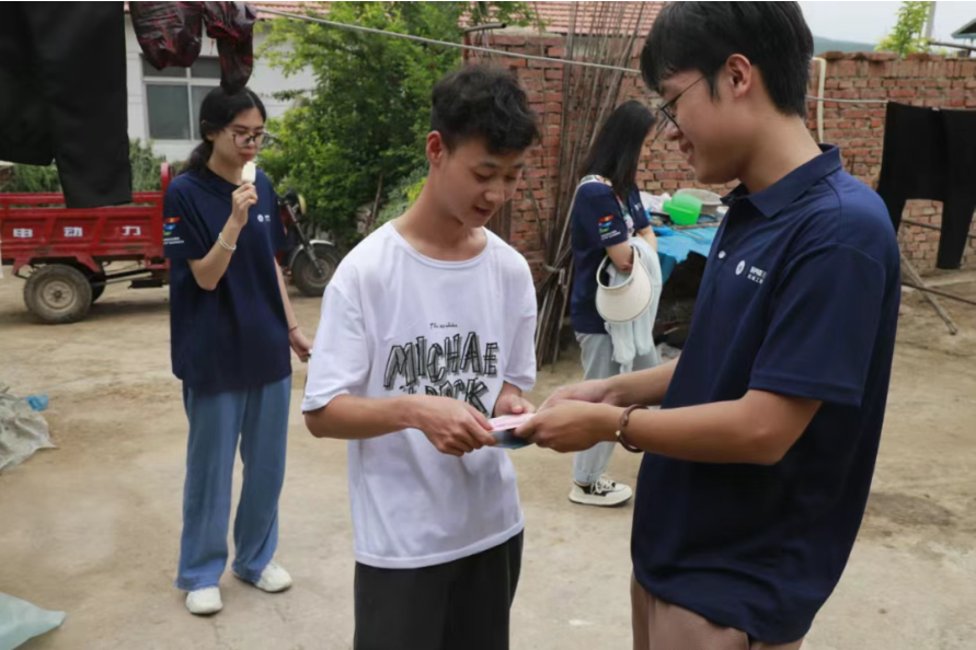 经过简单的休整,7月9日清晨李继强老师带领"情系水泉"实践队开始了首日的入户走访工作。当天上午,实践队有序走访了水泉村第一组、第七组的共7户村民家庭,总计发放助学金3600元。每到一户,都能感受到乡亲们扑面而来的热忱——一盘盘新鲜水果、一句句暖心家常,让队员们倍感亲切。实践队员俯下身子与老人促膝谈心,耐心询问近期身体状况与生活难题;蹲下身来和孩子轻声交流,细致了解孩子们学业进展与成长需求。在为帮扶家庭的学生送上助学金,也送上了"用知识改变命运"的鼓励与期许,让希望的种子在孩子们心中悄悄发芽。